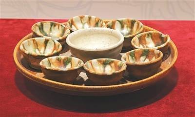 r唐代饮茶蔚然成风,且注重礼仪、讲究茶器。三彩子母盘是唐代茶具的代表,反映了当时茶文化的兴盛。9个小盏置于茶盘之上,盘底平、边缘浅,盏可平稳放立,取饮方便,又不易存污垢,便于清洗擦拭,同时兼具美观。